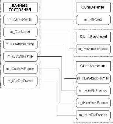 На Рисунок 8.21 вы можете видеть как переменные состояния связаны с соответствующими базовыми типами. Например, максимальное значение номера кадра анимации ожидания берется из находящегося в классе анимации поля с количеством кадров анимации ожидания.